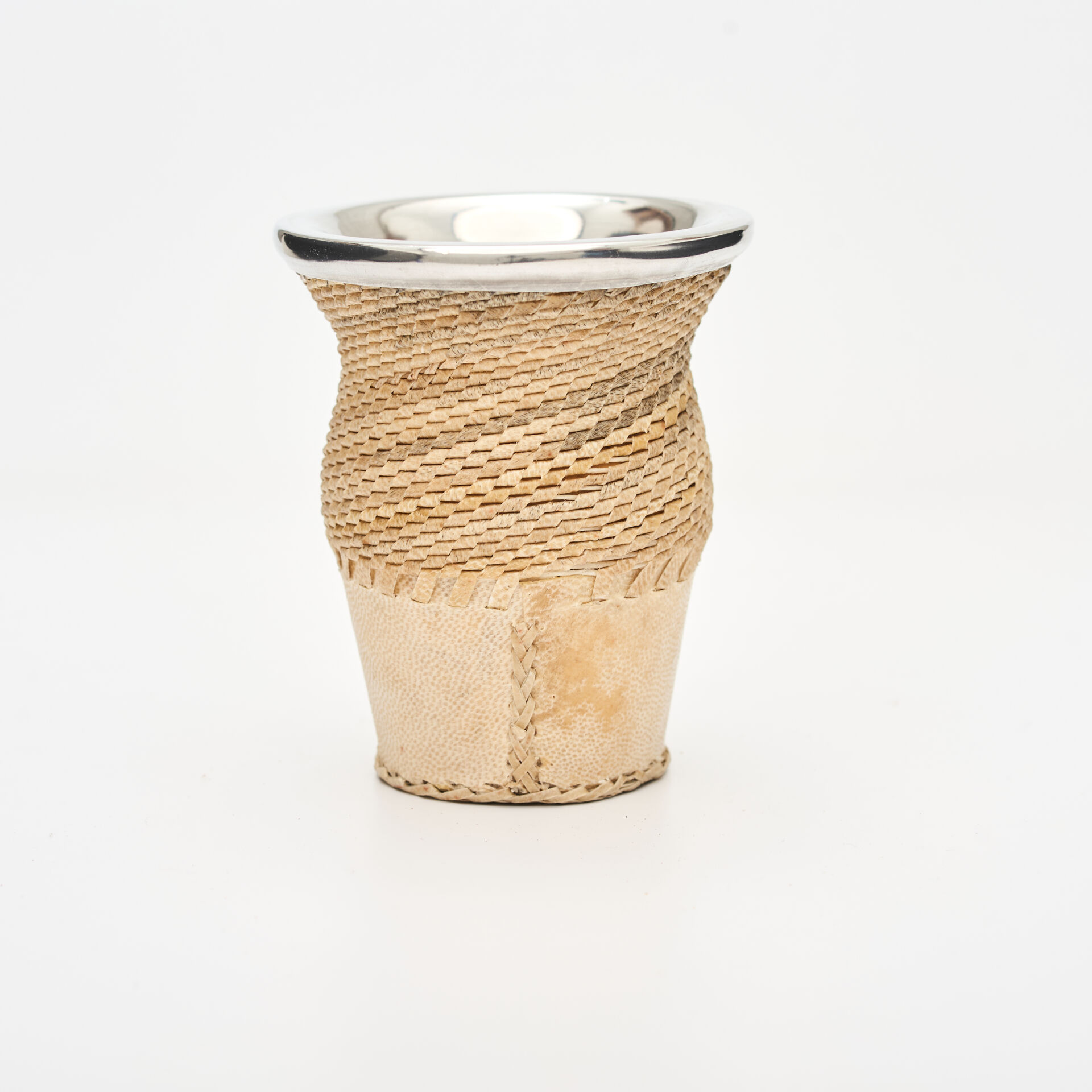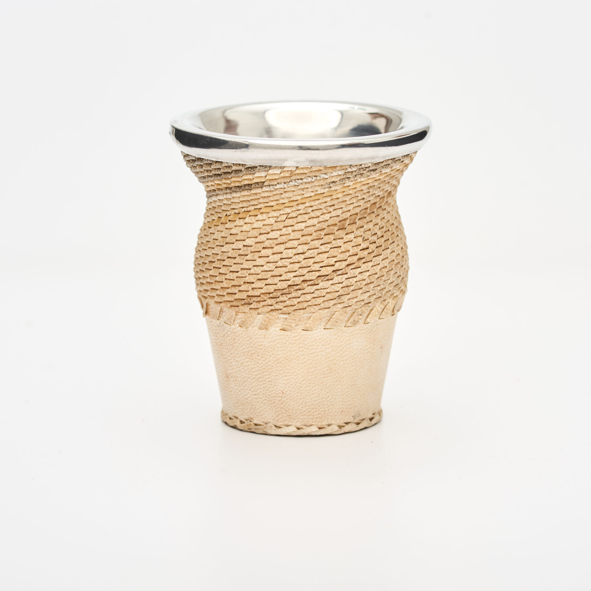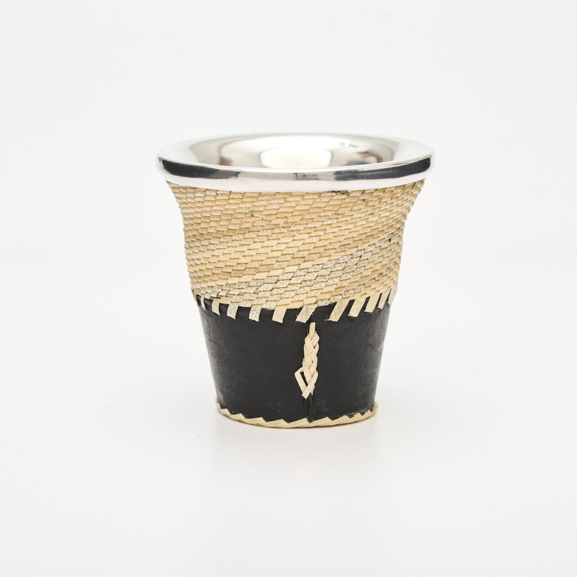 Revestimiento en Cuero Crudo Trenzado: Un trabajo artesanal de alta complejidad que utiliza tientos de cuero crudo legítimo. Este tejido no solo aporta una textura rústica y un agarre antideslizante, sino que refuerza la estructura del mate otorgándole una durabilidad superior.