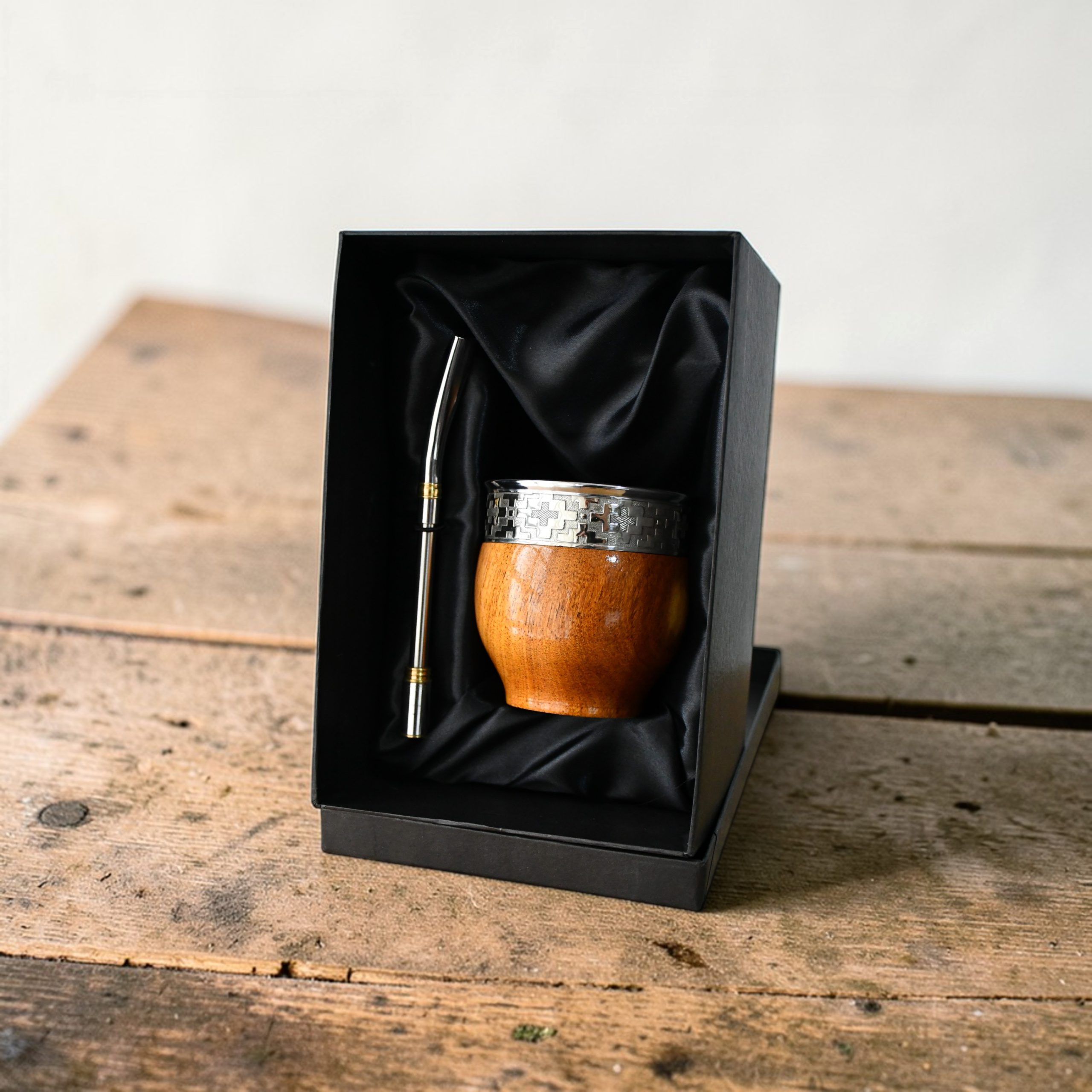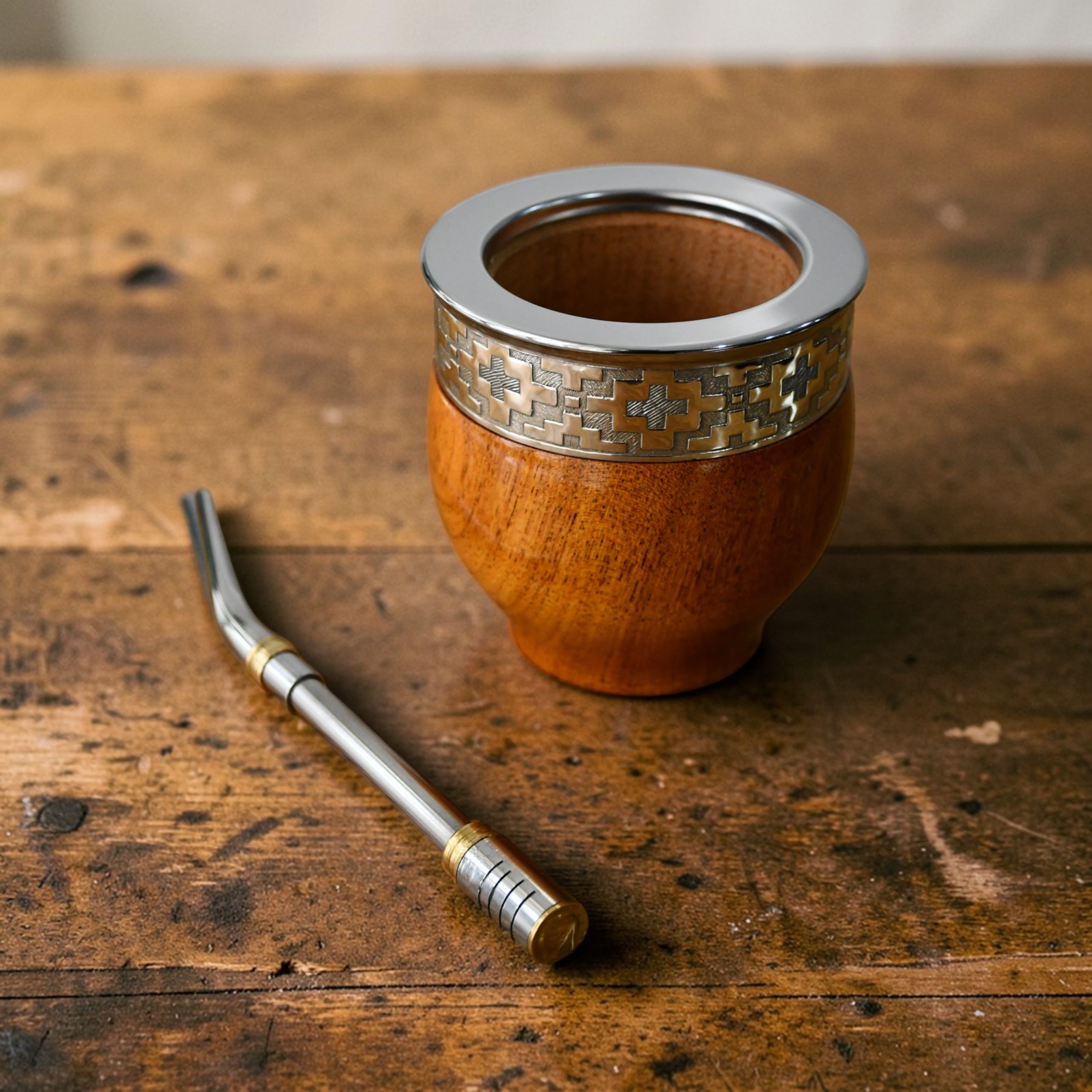 Mate Imperial de Algarrobo con cinta abstracta / Guarda Pampa: Tallado en madera de algarrobo macizo de primera selección. Posee una base estilo copa para una estabilidad total y una virola lisa de acero inoxidable con cinta de alpaca que aporta un acabado moderno y limpio.