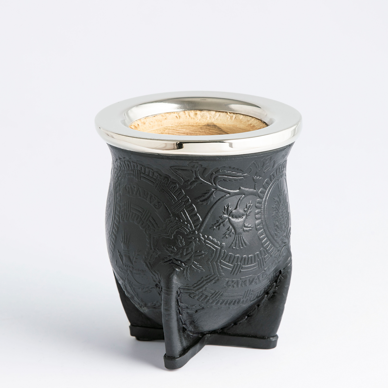 Interior de Madera de Algarrobo: Tallado en madera nativa de primera selección. El algarrobo es la madera predilecta para el mate por su gran inercia térmica, su resistencia al paso del tiempo y la capacidad de realzar el sabor de la yerba con un curado noble.
