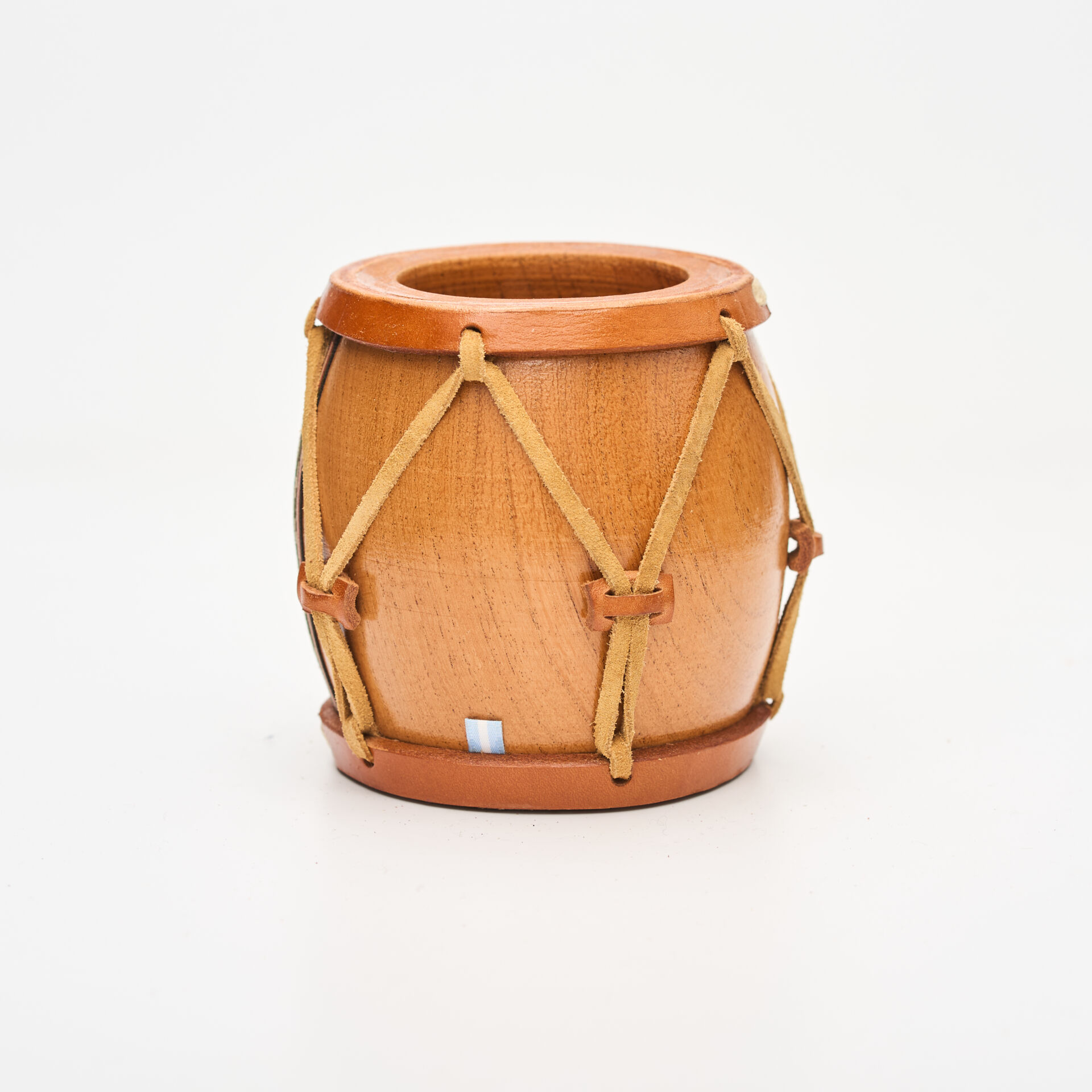 Presencia absoluta en cada cebada. Esta pieza de TodoMates es un homenaje a nuestra cultura folclórica. Inspirado en la forma del bombo legüero, este mate combina la nobleza de la madera de algarrobo con un detallado trabajo de diseño en cuero que le otorga una identidad rústica y artesanal inigualable.